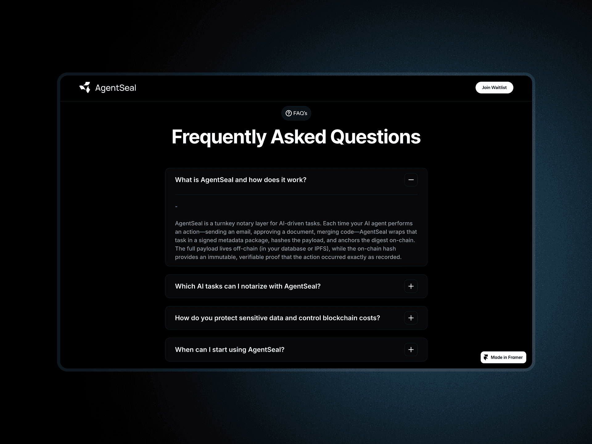 I designed and developed the marketing website for AgentSeal, a blockchain-powered platform that brings on-chain verification to AI agent actions. The goal was to present a highly technical product in a way that feels accessible, trustworthy, and future-facing—highlighting its benefits for compliance, transparency, and enterprise adoption.