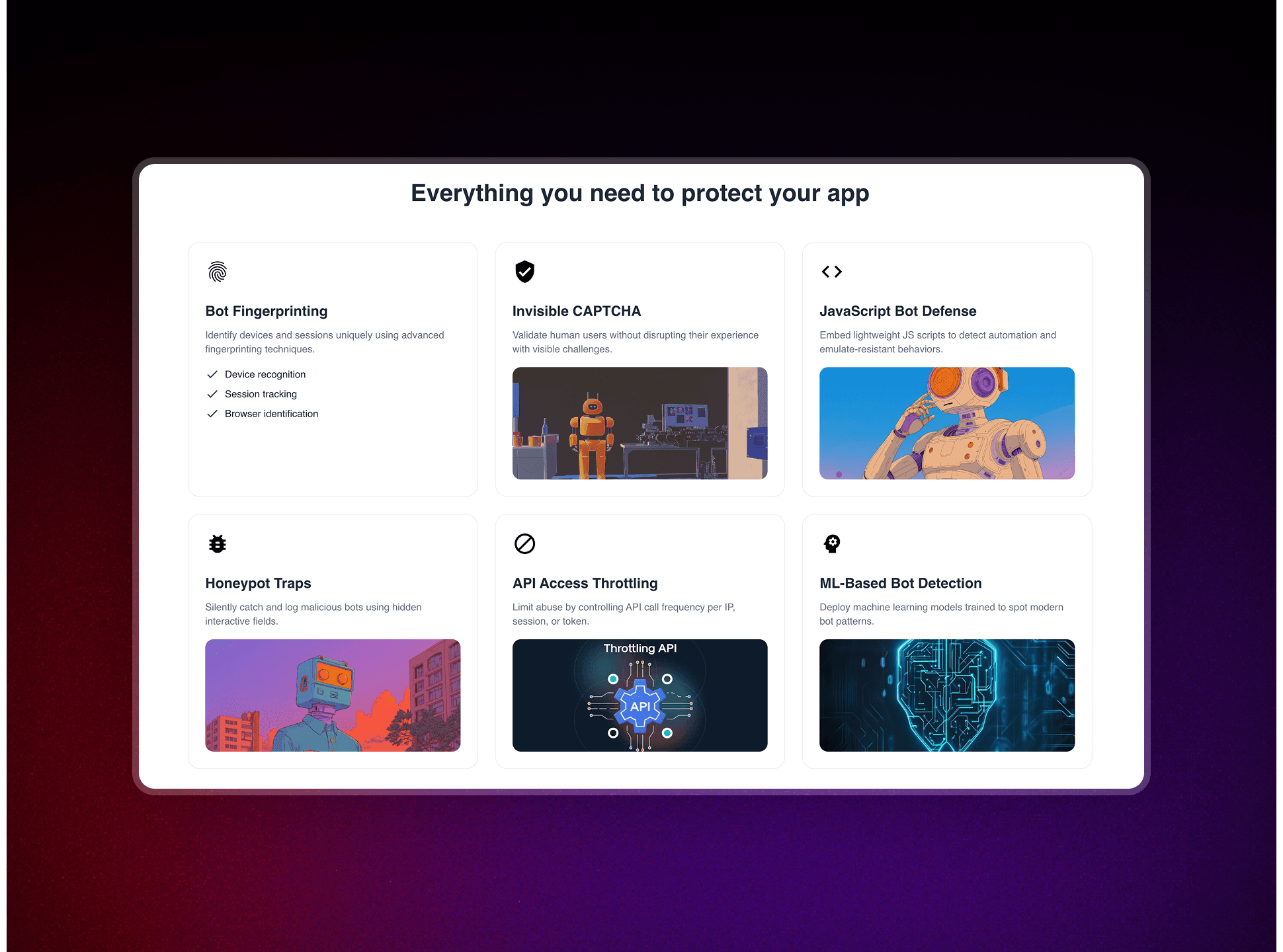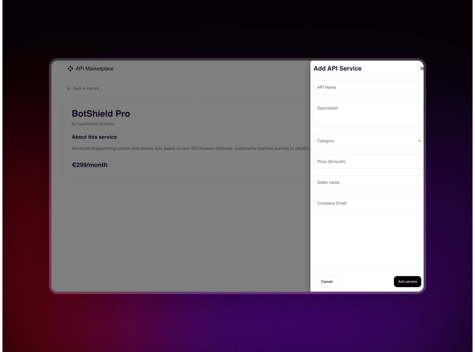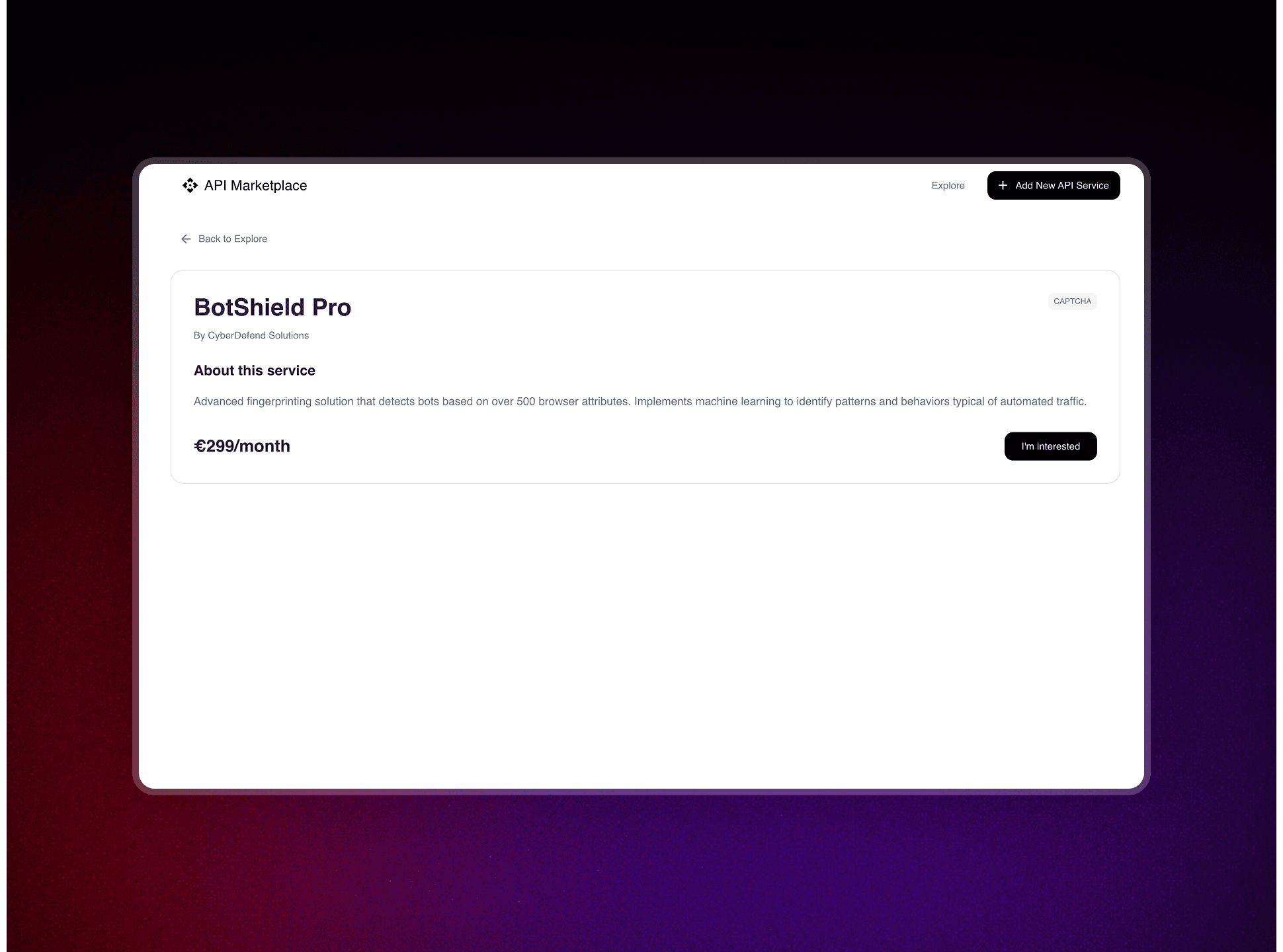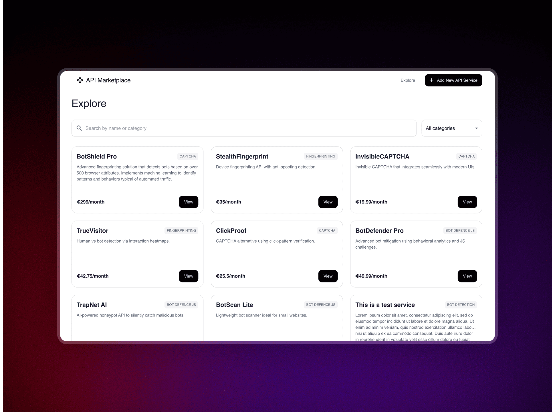 This is a minimal web application functioning as a small-scale marketplace for antibot API services, built for a coding challenge with a focus on clean structure and rapid development.