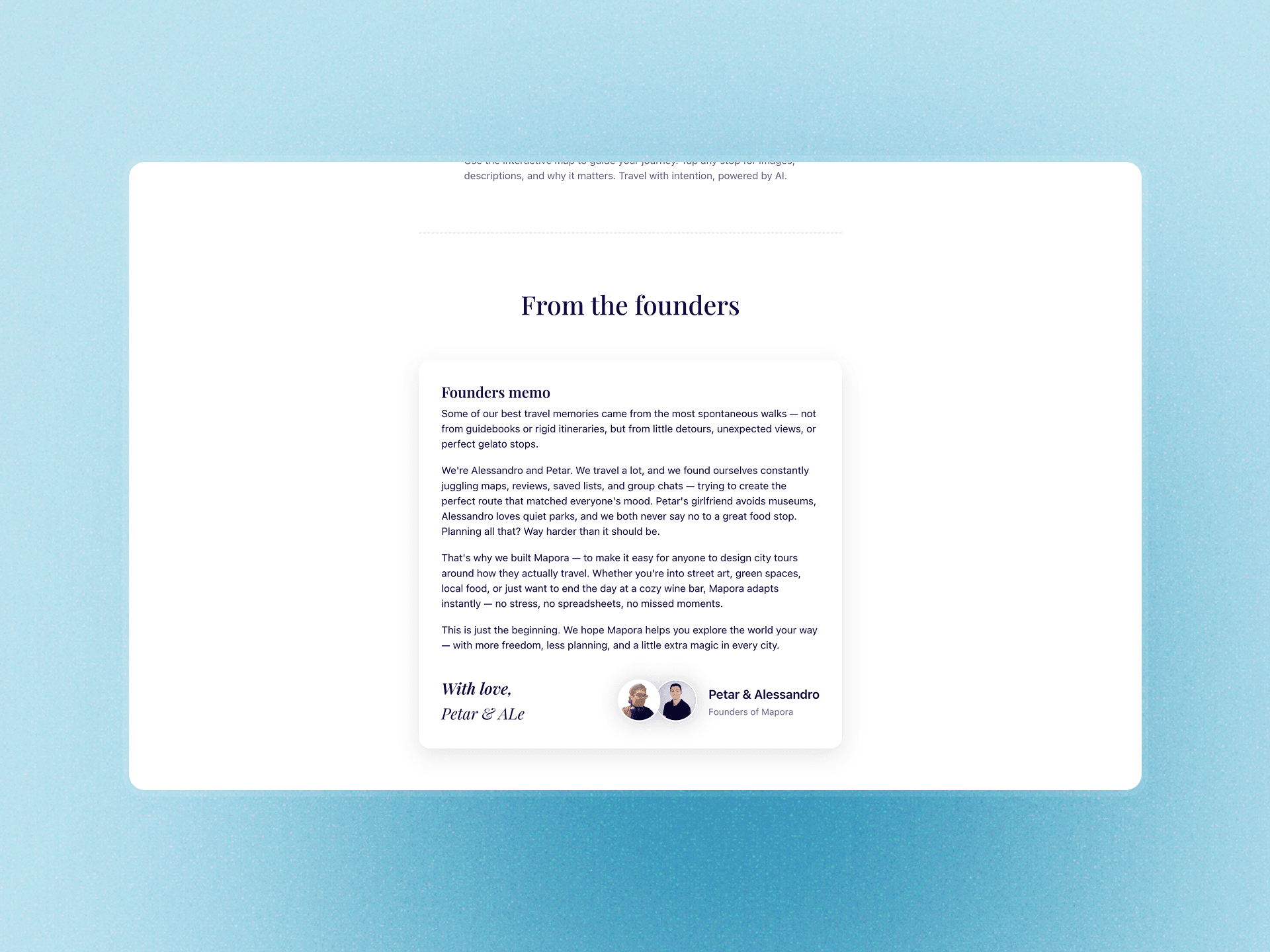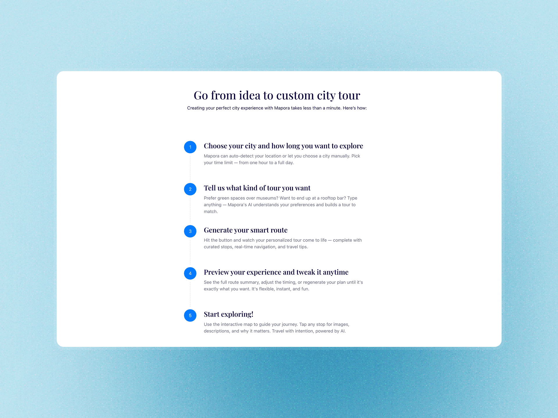 The Mapora website is a responsive, single-page web experience designed to introduce the Mapora app to users, partners, and judges. Built with React and Material UI, the site highlights the app’s core features, use cases, and design philosophy through clean layouts, interactive elements, and concise storytelling.